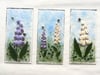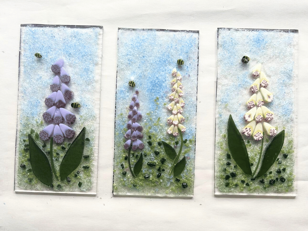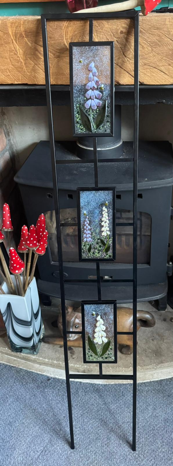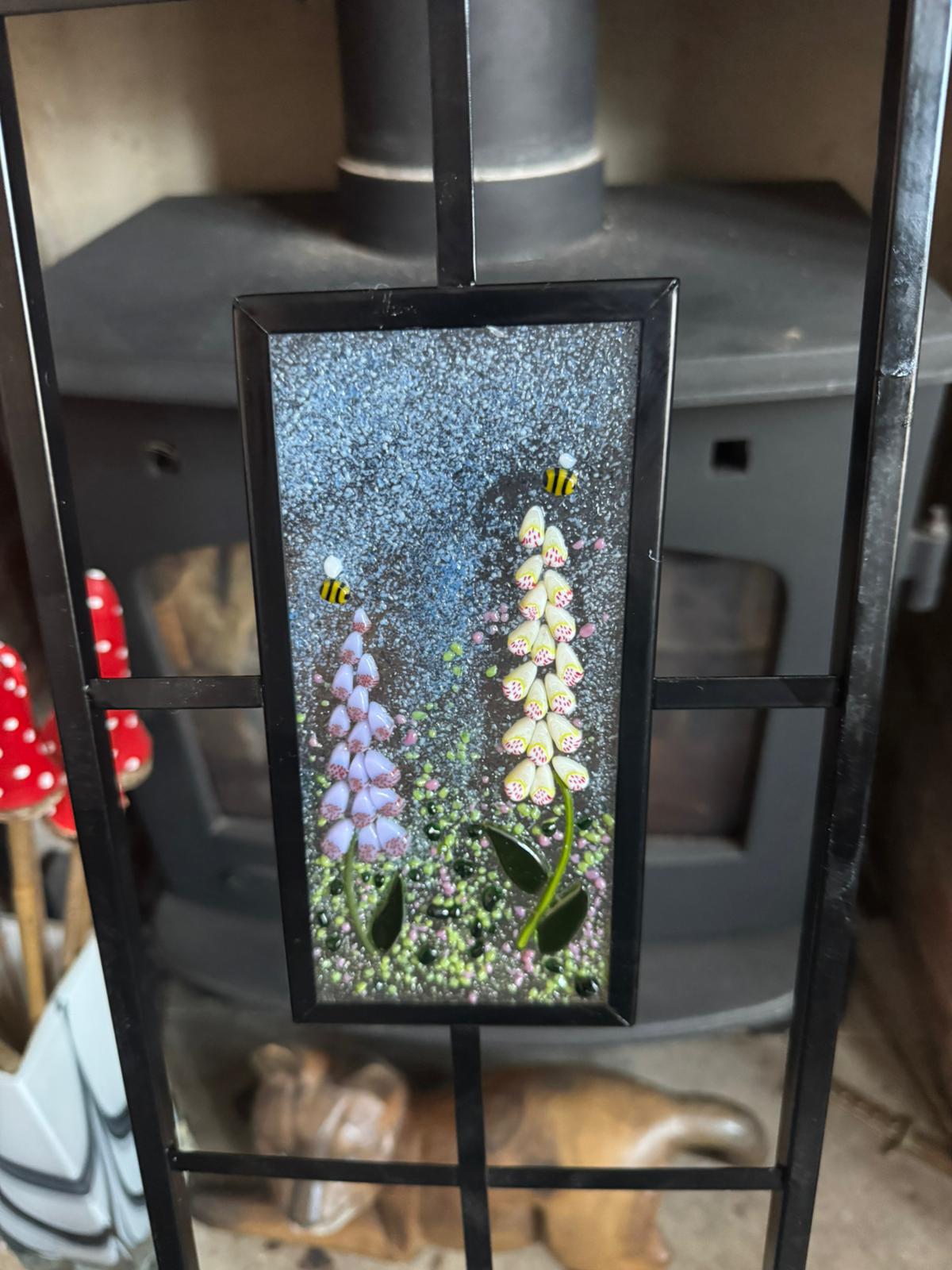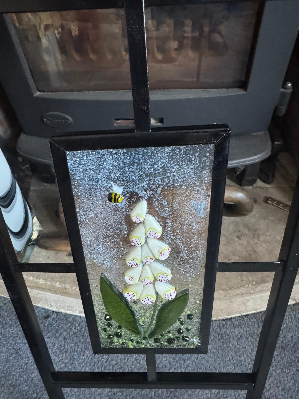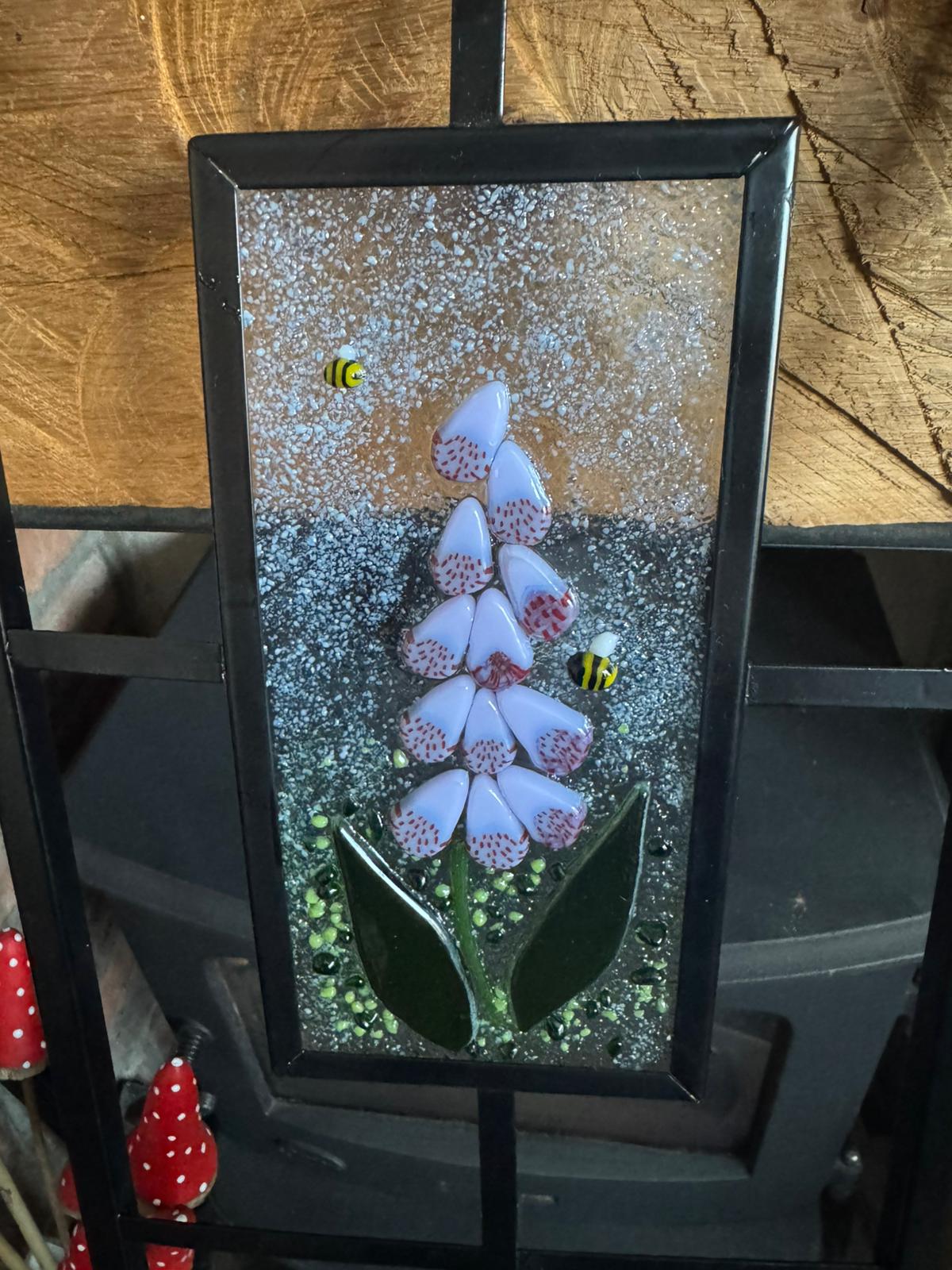 Modern-looking square-section design with each square section containing a fused glass panel depicting Foxglove-style flowers, measuring 18x9 cm.